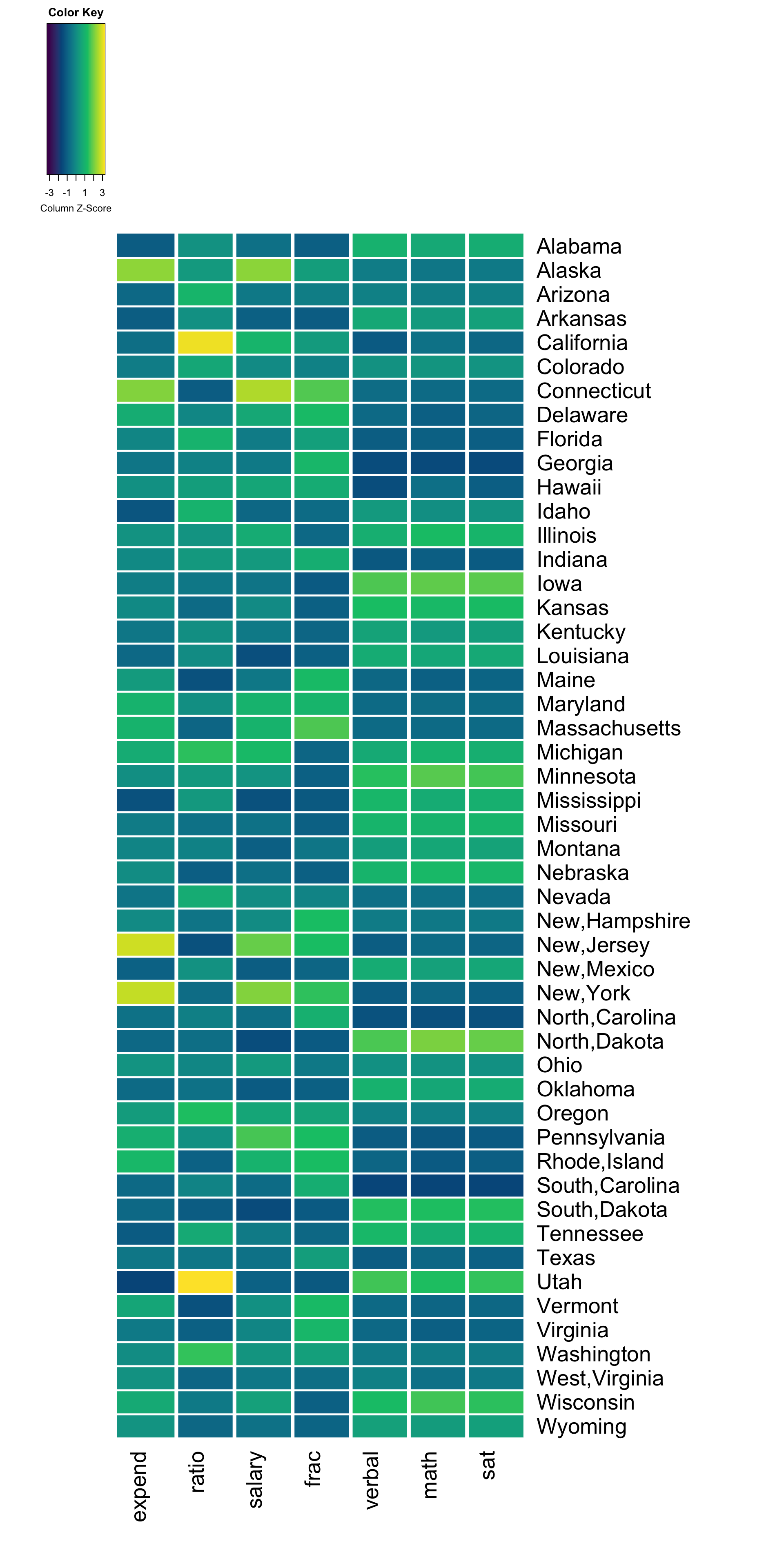 Note that each variable (column) is scaled to indicate states (rows) with high values (yellow) to low values (purple/blue).