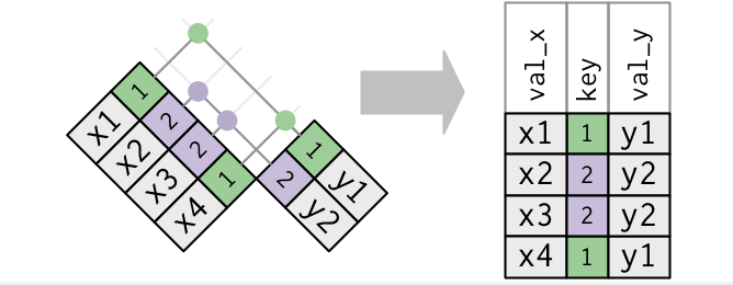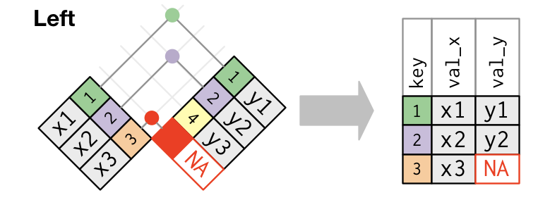 left_join(): the output has all cases from the left, regardless if there is a match in the right, but discards any cases in the right that do not have a match in the left.
