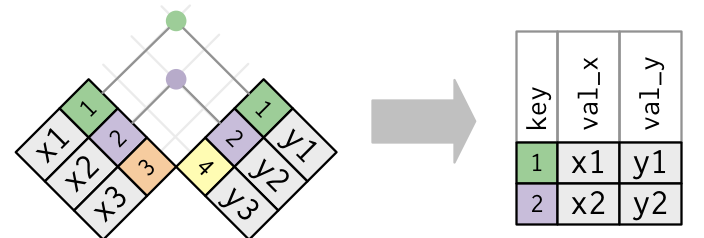 A mutating join allows you to combine variables from two tables. It first matches observations by their keys, then copies across variables from one table to the other.