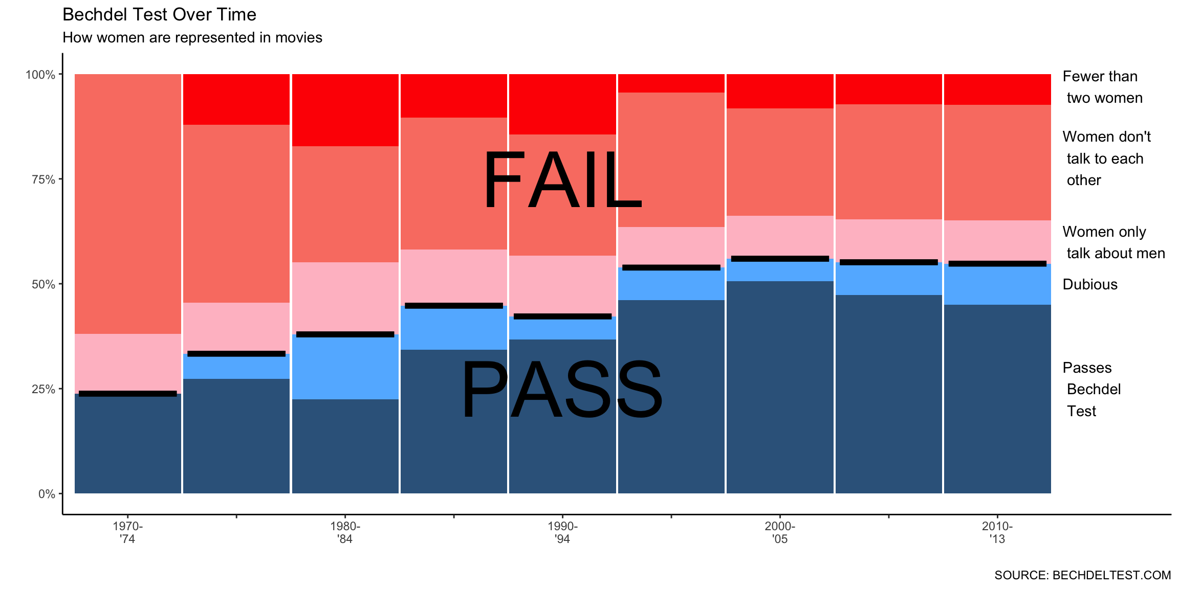 label = c('Fewer than\n two women',"Women don't\n talk to each\n other", 'Women only\n talk about men','Dubious','Passes\n Bechdel\n Test'),