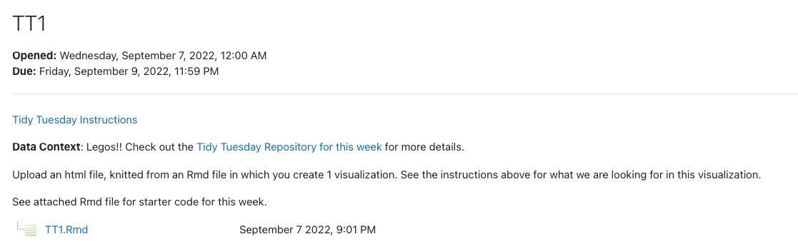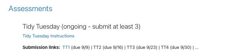 You must complete 3 Tidy Tuesday assignments, at a minimum.