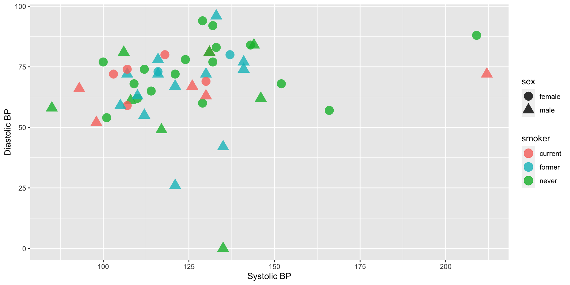 ggplotUsing the ggplot2 package, we can create graphics by building up layers, each of which may have its own data, glyphs, aesthetic mapping, etc.
