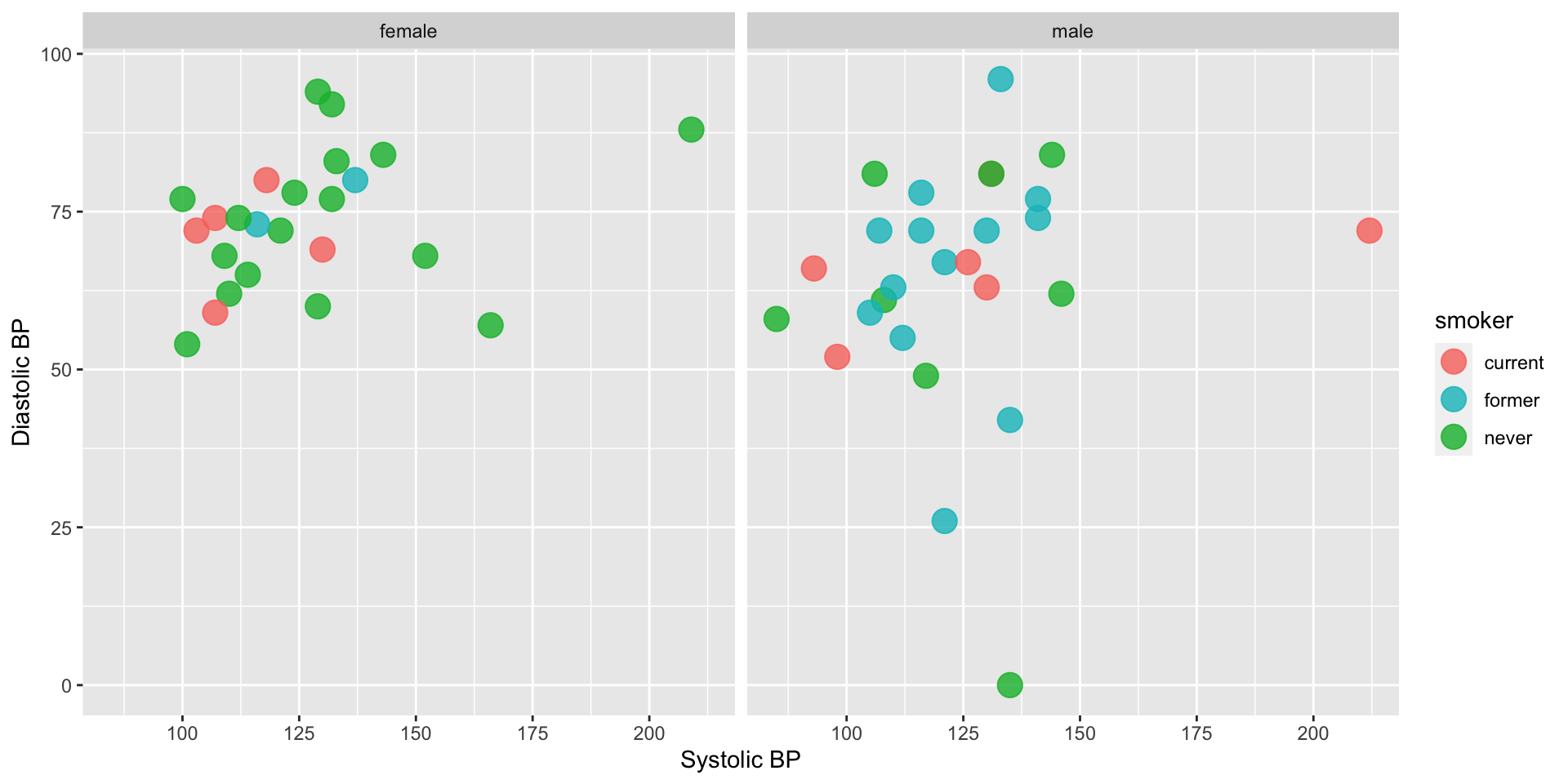 If instead we wanted to facet into columns based on smoker status, we could add another layer for that: