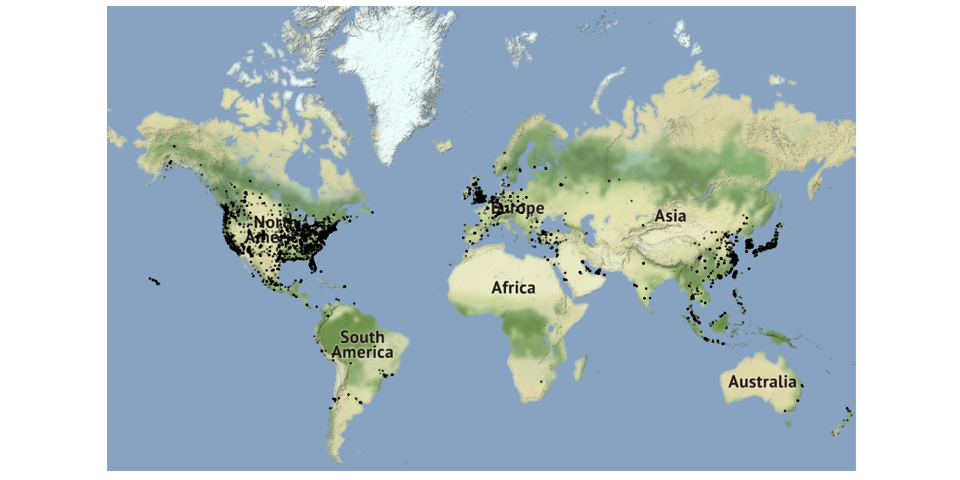 The Starbucks data, compiled by Danny Kaplan, contains information about every Starbucks in the world at the time the data were collected. It includes the Latitude and Longitude of each location. Let’s start by using familiar ggplot plotting tools.