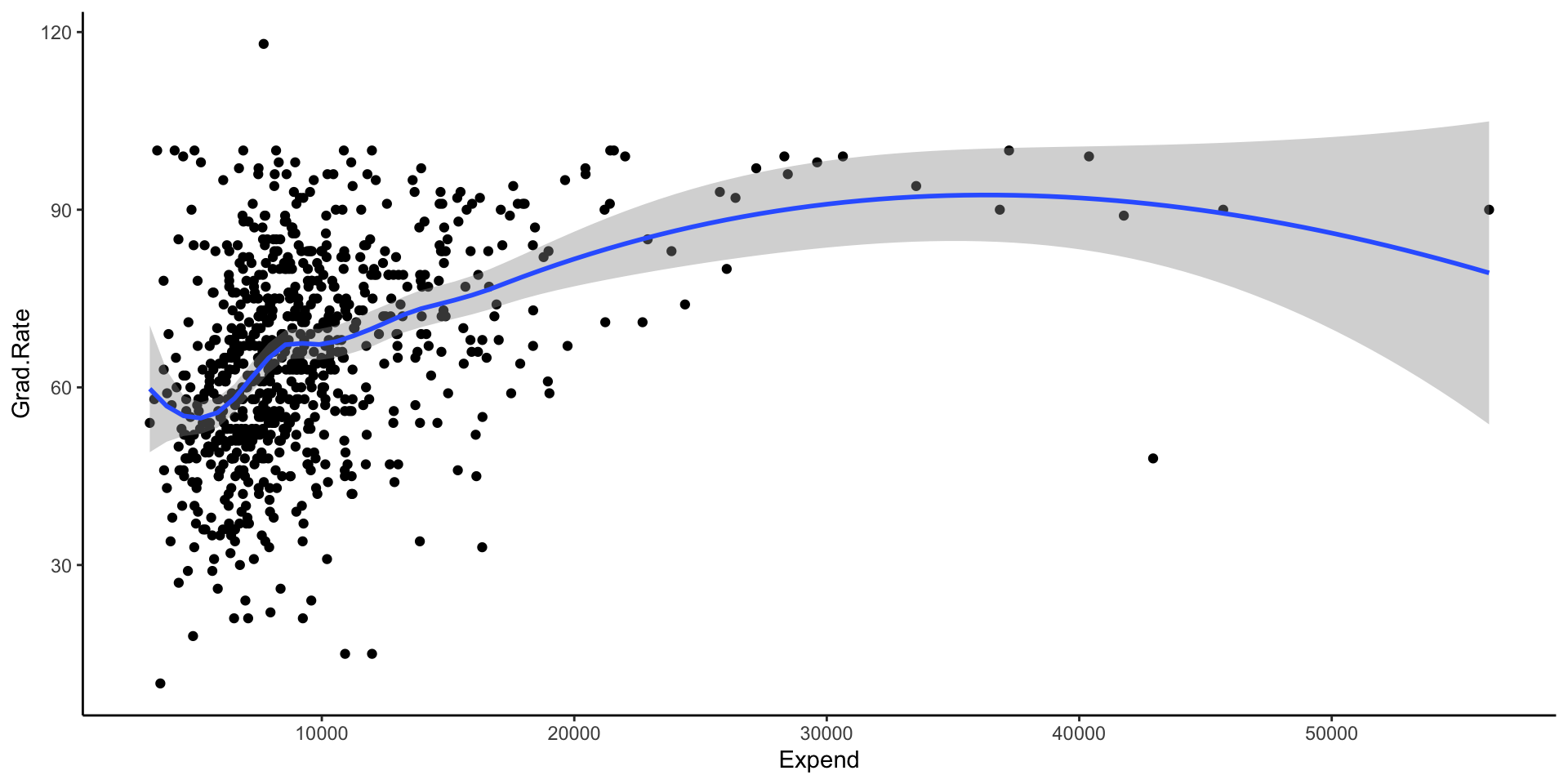 In the previous activity, we modeled college Grad.Rate versus Expend, Enroll, and Private using data on 775 schools.