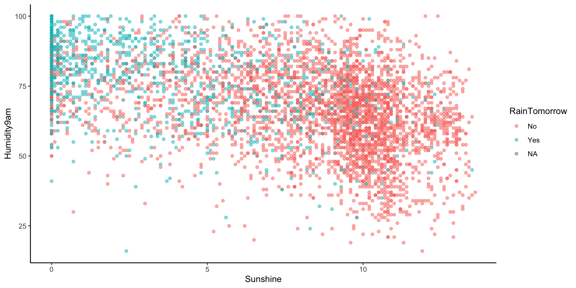 Let’s model RainTomorrow, whether or not it rains tomorrow in Sydney, by two predictors: