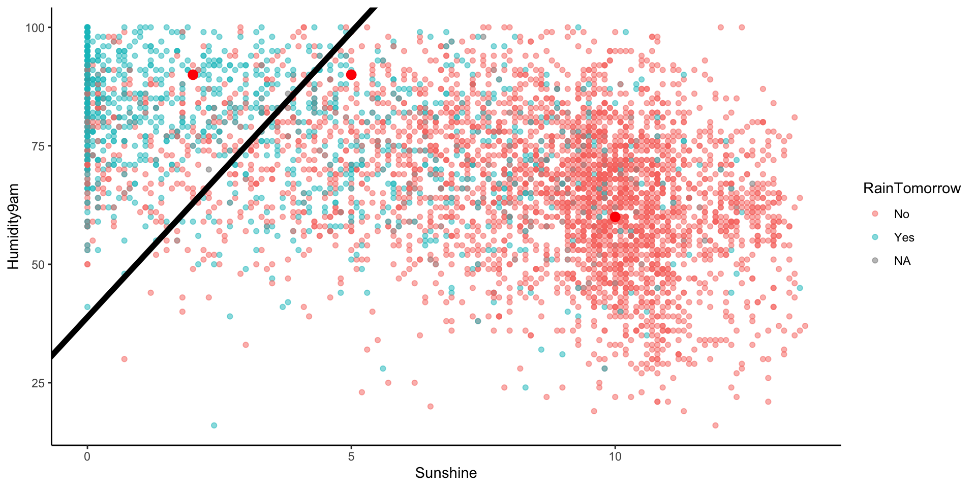 Let’s translate this into a classification rule that partitions the data points into rain / no rain predictions based on the predictor values.