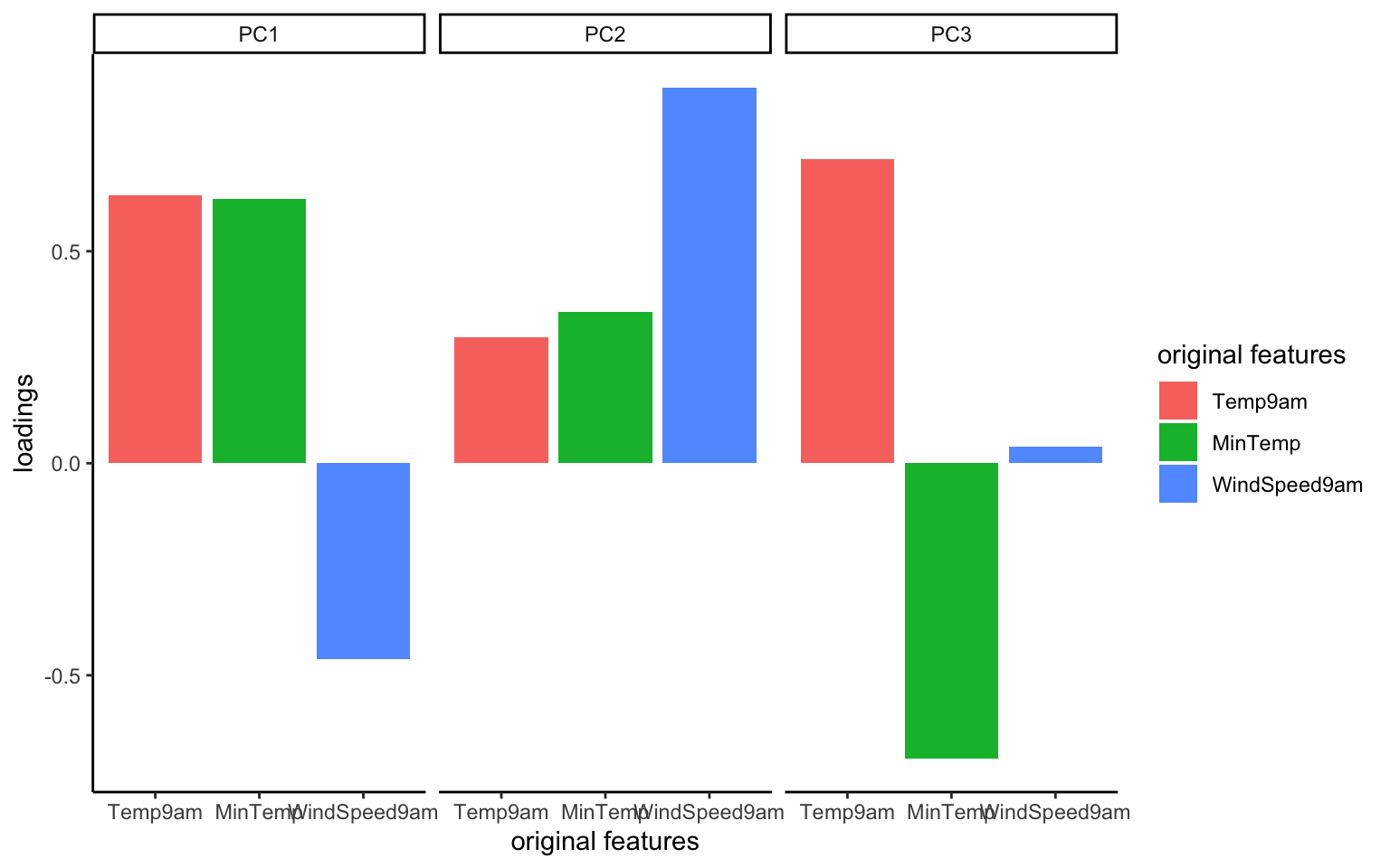 This creates 3 PCs which are each different combinations of the (standardized) original features: