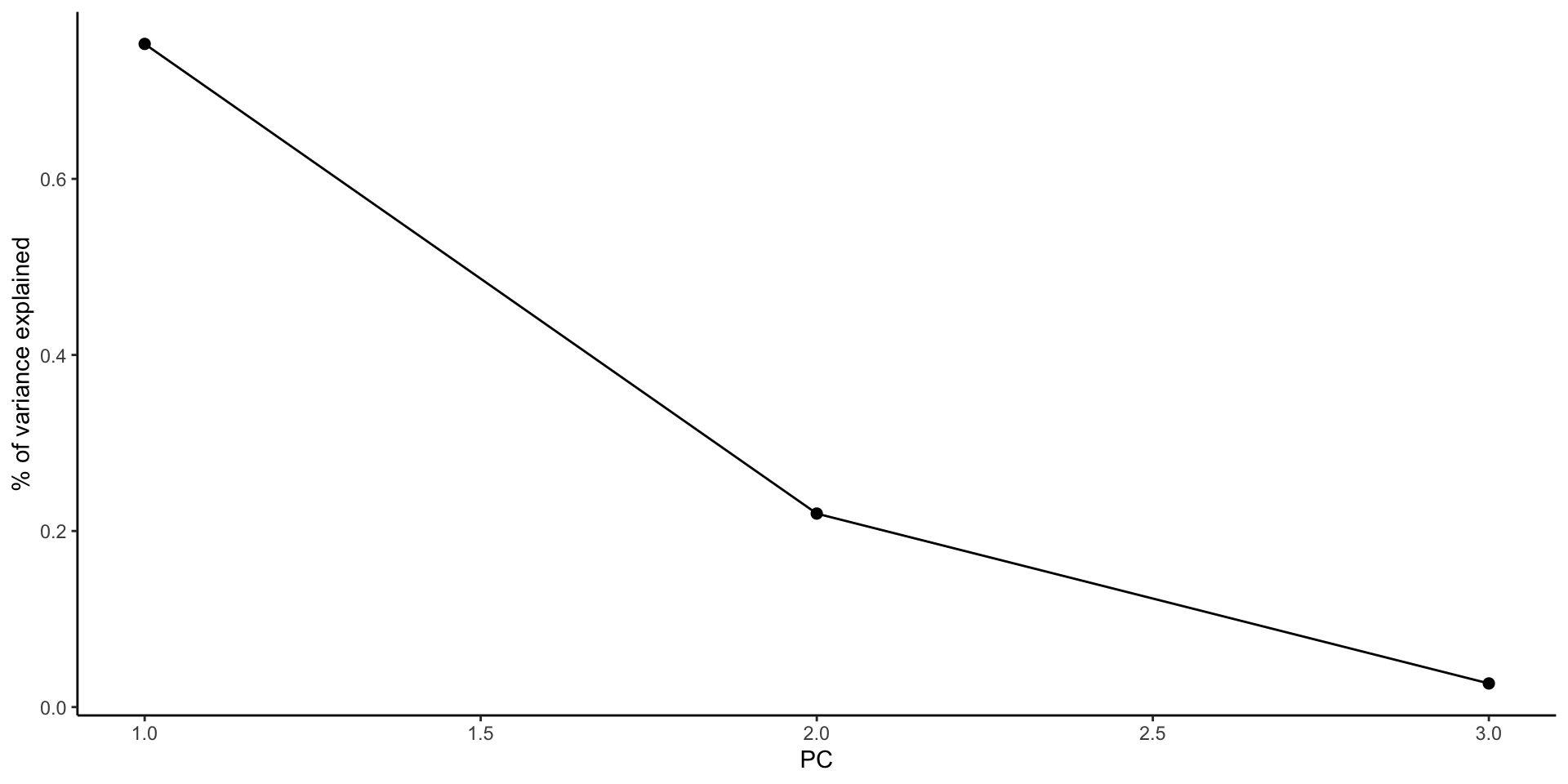 # Load package for tidy tablelibrary(tidymodels)# Measure information captured by each PC# Calculate variance from standard deviationpca_small %>%tidy(matrix ="eigenvalues") %>%mutate(var = std.dev^2)