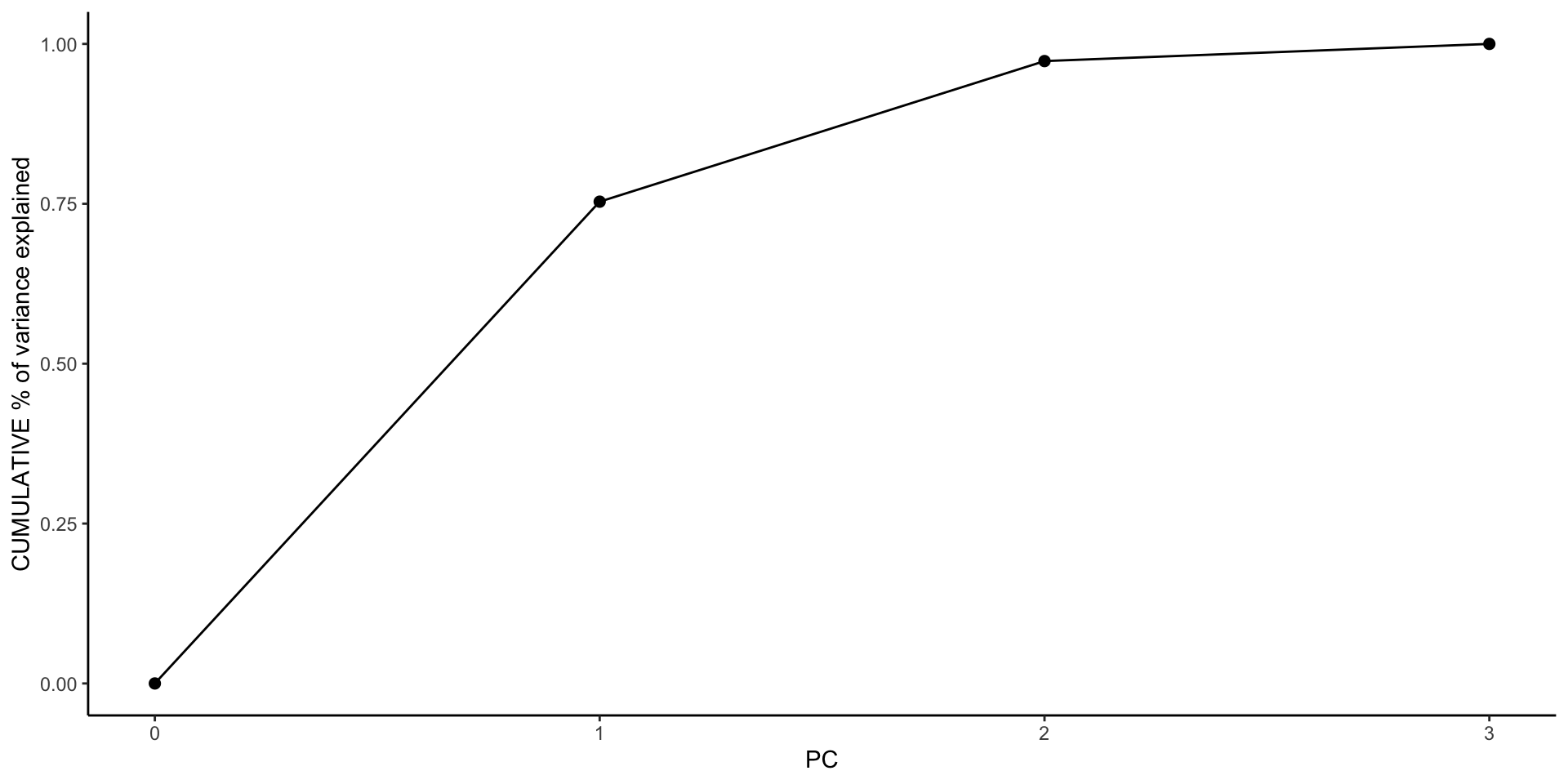 In total, 100% of the original information is captured by PC1, PC2, and PC3. What % of the original info would we retain if we only kept PC1 and PC2, i.e. if we reduced the PC dimensions by 1? Confirm using both the percent and cumulative columns.