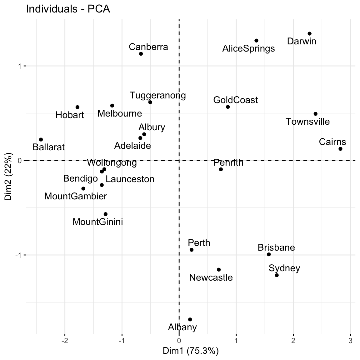 A score plot maps out the scores of the first, and most important, 2 PCs for each city. PC1 is on the x-axis and PC2 on the y-axis.