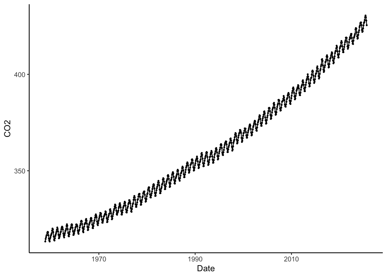 # Save data as a ts (time series) object to keep track of time and the values.co2_ts_data <-ts(co2$CO2, start =c(1958,11), frequency =12)