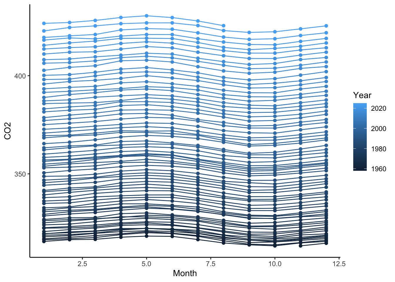 co2 %>%ggplot(aes(x = Month, y = CO2, group = Year, color = Year)) +geom_point() +geom_line() +theme_classic()