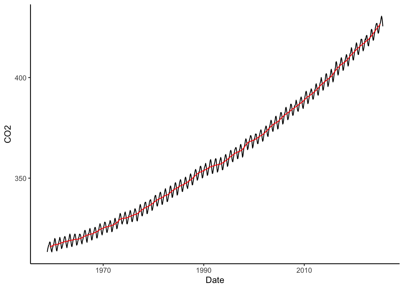 co2_ts_data <-ts(co2$CO2, start =c(1958,11), frequency =12) # ts (time series) objects keeps track of timefltr <-c(0.5, rep(1, 11), 0.5)/12#vector of weights for moving average filterco2 <- co2 %>%mutate( co2Trend_MA =as.numeric(stats::filter(co2_ts_data, filter = fltr, method ='convo', sides =2)))co2 %>%ggplot(aes(x = Date, y = CO2)) +geom_line() +geom_line(aes(y = co2Trend_MA), color ='red') +theme_classic()