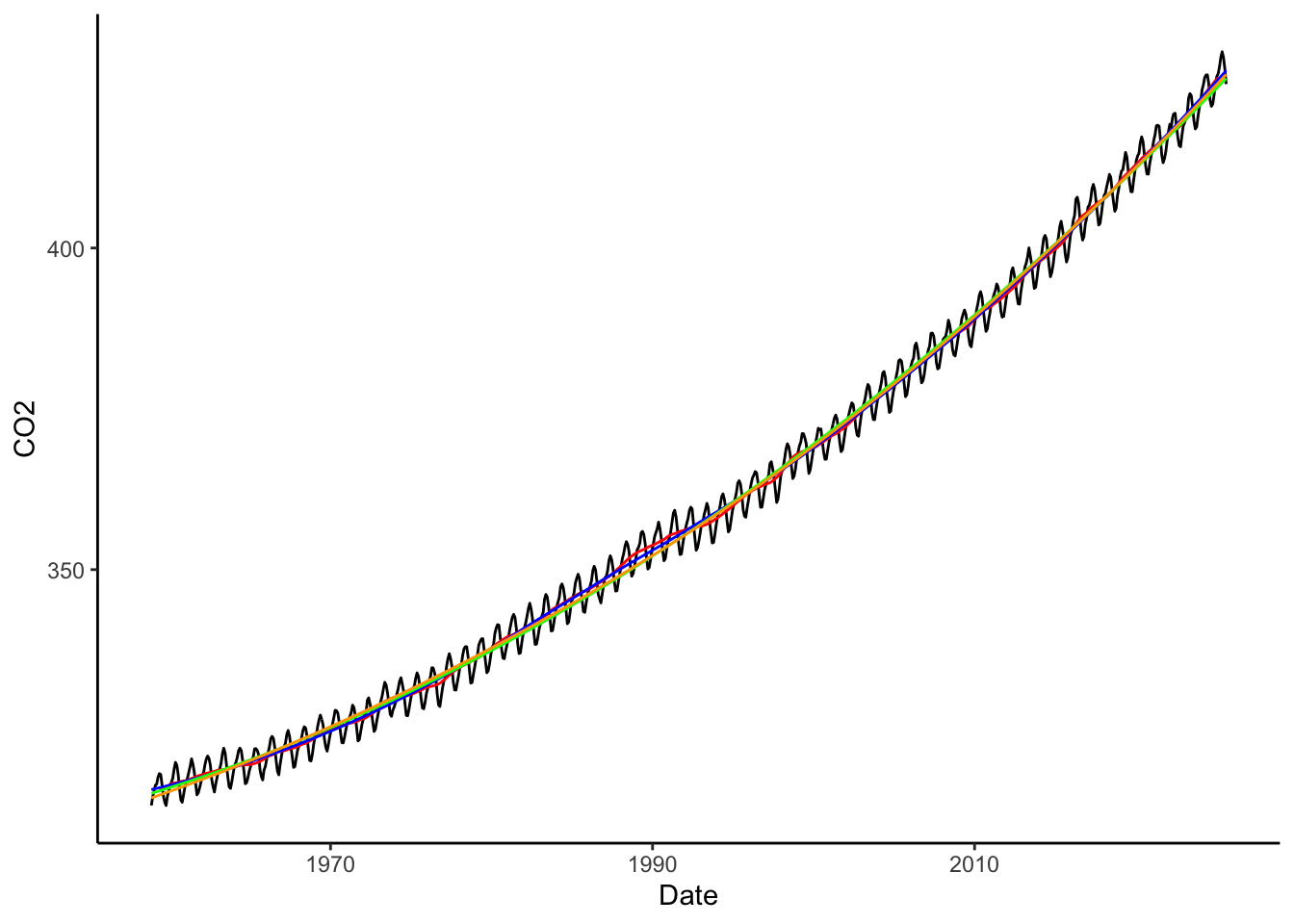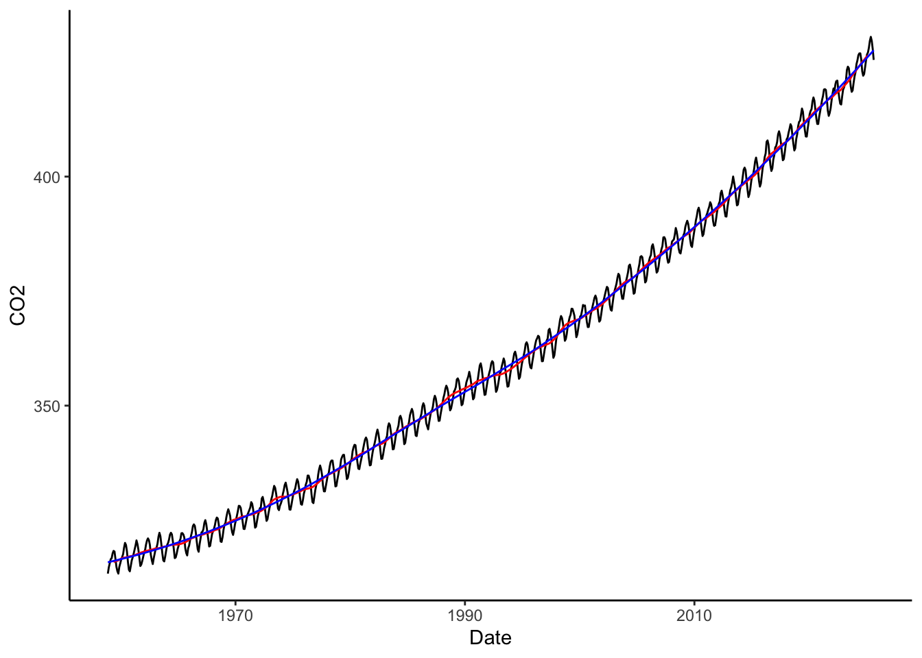 co2 <- co2 %>%mutate(co2Trend_loess =predict(loess(CO2 ~ Date, data = co2, span =0.5)))co2 %>%ggplot(aes(x = Date, y = CO2)) +geom_line() +geom_line(aes(y = co2Trend_MA), color ='red') +geom_line(aes(y = co2Trend_loess), color ='blue') +theme_classic()