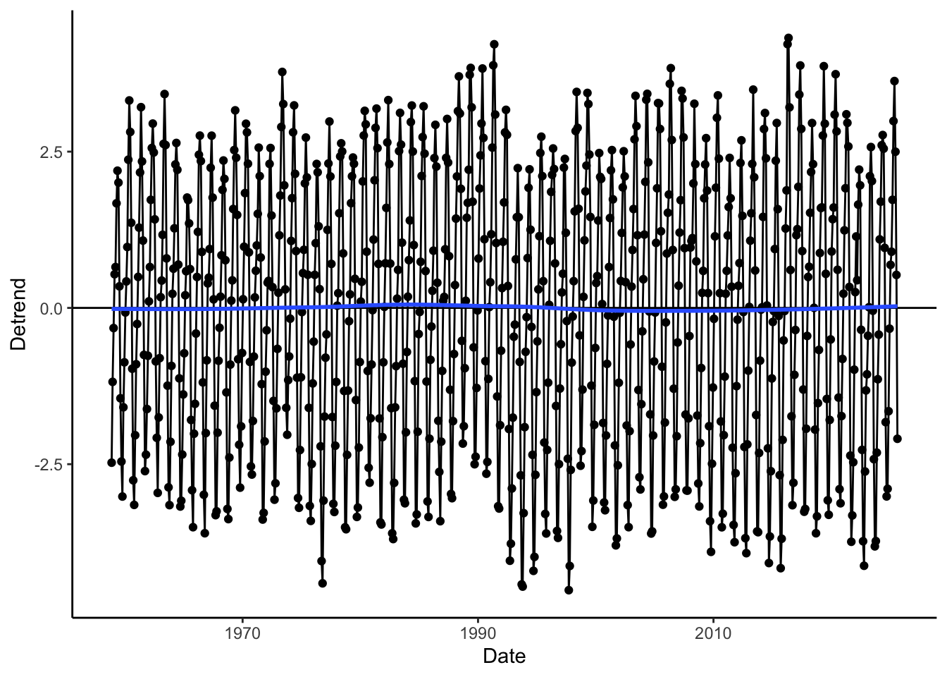 co2 <- co2 %>%mutate(Detrend = CO2 - co2Trend_loess) # or co2Trend_MA, co2Trend_1, or co2Trend_2co2 %>%ggplot(aes(x = Date, y = Detrend)) +geom_point() +geom_line() +geom_hline(yintercept =0) +geom_smooth(se =FALSE) +theme_classic()