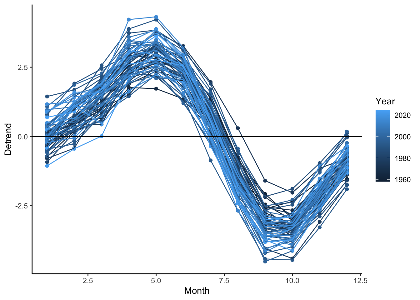 co2 %>%ggplot(aes(x = Month, y = Detrend, group = Year, color = Year)) +geom_point() +geom_line() +geom_hline(yintercept =0) +theme_classic()