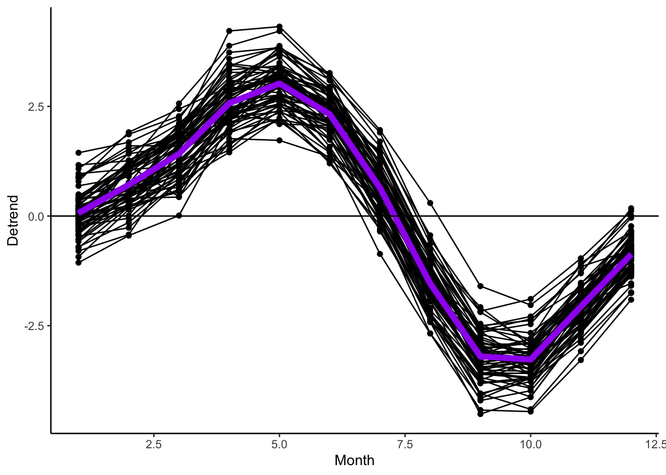 lm.season <-lm(Detrend ~factor(Month), data = co2)co2 <- co2 %>%mutate(Season =predict(lm.season, newdata = co2))co2 %>%ggplot(aes(x = Month, y = Detrend, group = Year)) +geom_point() +geom_line() +geom_line(aes(y = Season), color ='purple', size =2) +geom_hline(yintercept =0) +theme_classic()