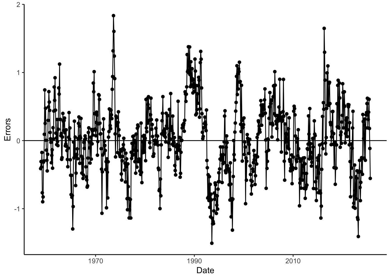 co2 <- co2 %>%mutate(Errors = Detrend - Season)co2 %>%ggplot(aes(x = Date, y = Errors)) +geom_point() +geom_line() +geom_hline(yintercept =0) +theme_classic()