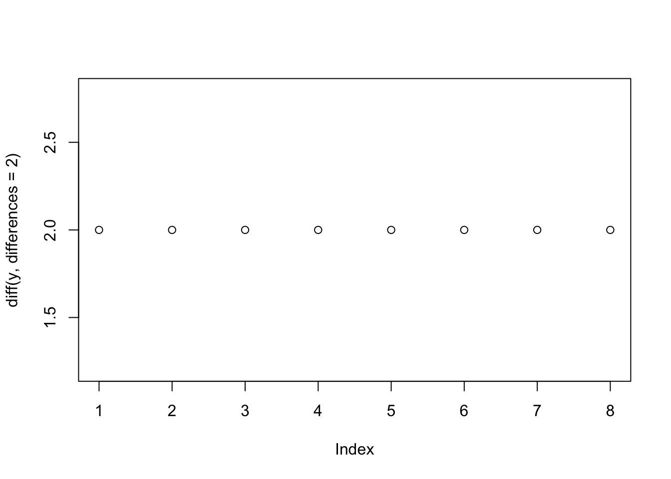 Imagine a random process with quadratic trend (\(y_t = t^2\)). What will a first-order difference look like? Prove it to yourself algebraically (and then look at the graph).