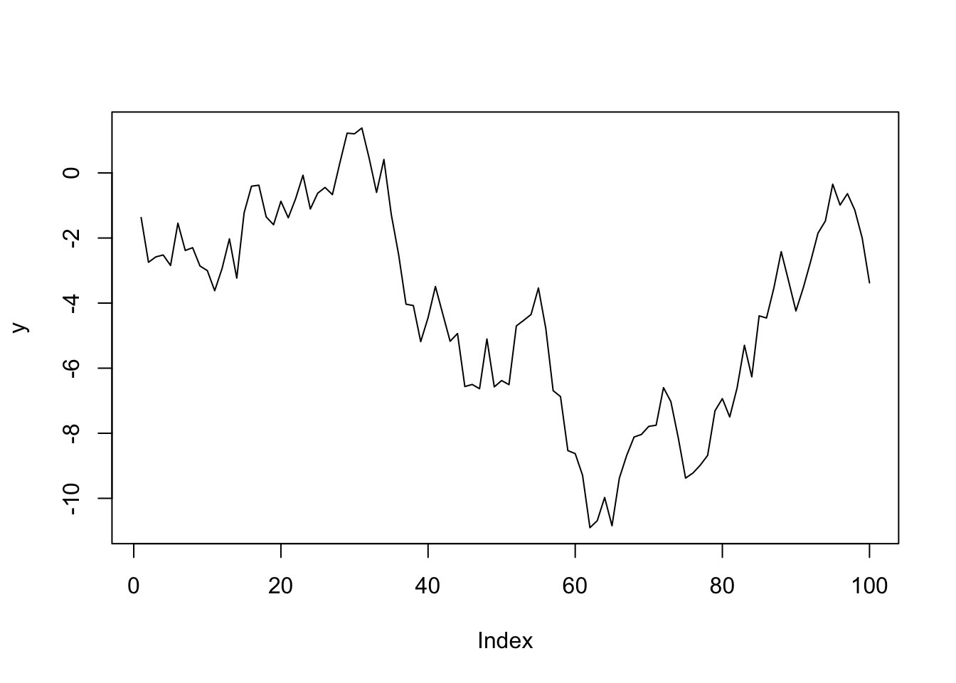 e =rnorm(100)y =cumsum(e)plot(y,type='l')