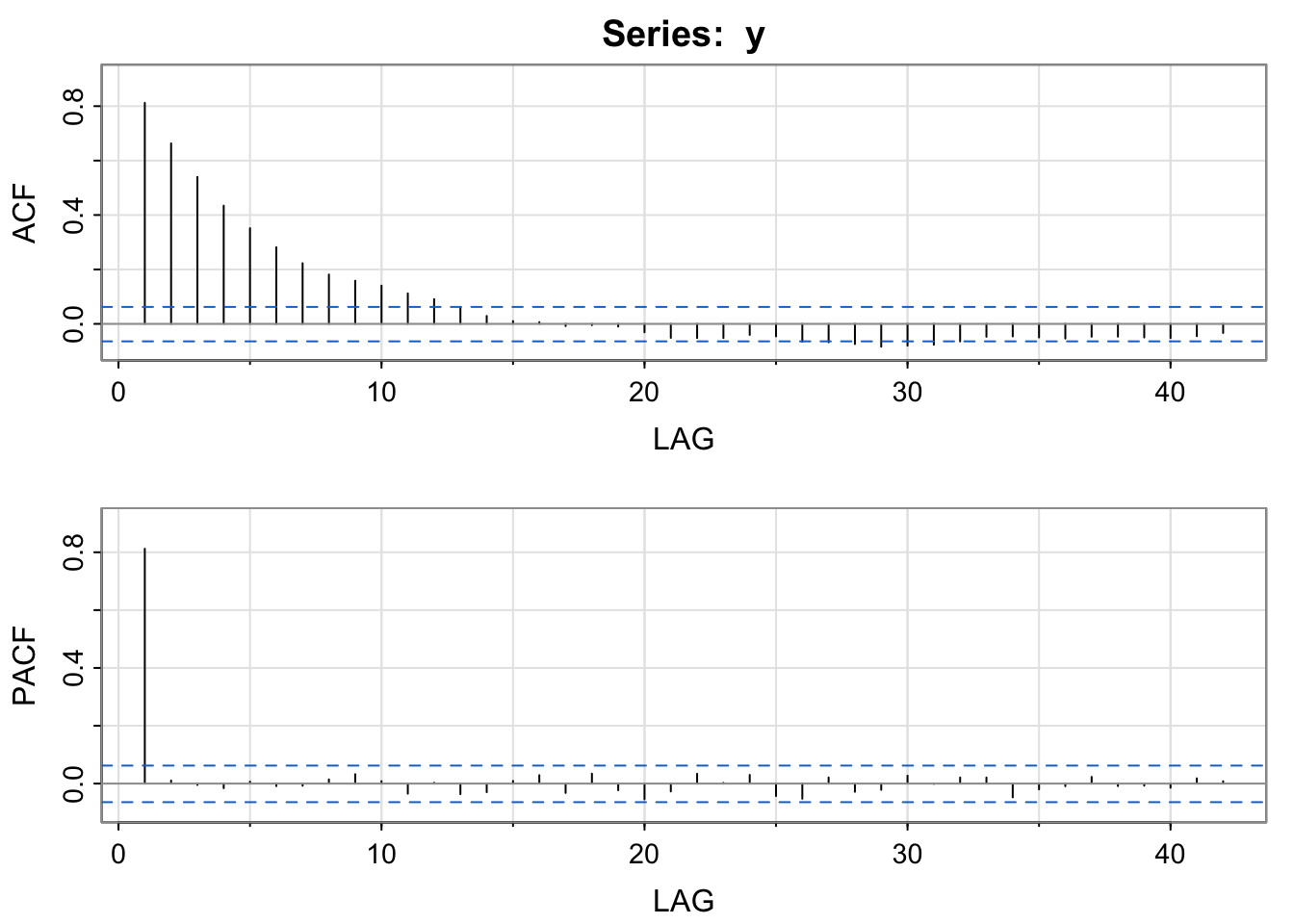::acf2(y) # estimates and plots ACF and PACF astsa