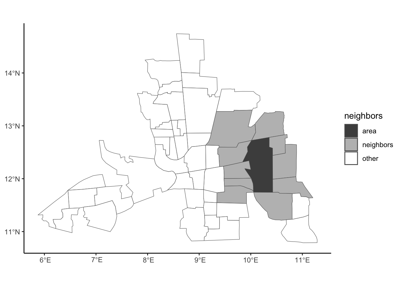 - The values can reflect whether or not the \(i\) area is a neighbor of the \(j\) area (0: not neighbor, 1: neighbor)